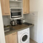Lave-linge (neuf), étendoir, table et fer à repasser.
